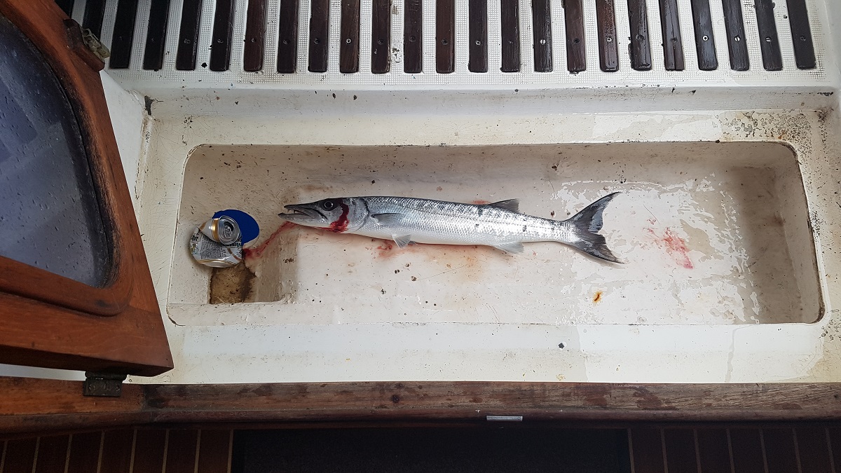 Just as we turn into the bay to anchor upon arriving in Dominica, we catch a small Barracuda on the line.