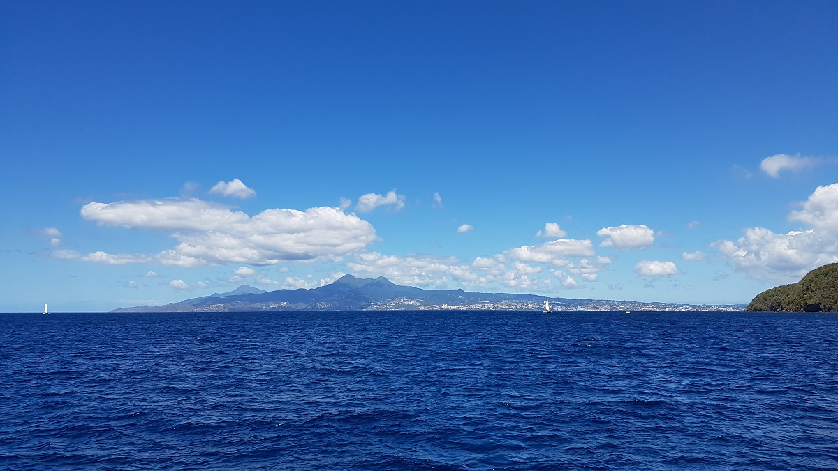 A rare view of both Morne Rouge and Mont Pelée (in the background) without their usual cloudy crowns on our sail up from Grand Anse to Saint Pierre.