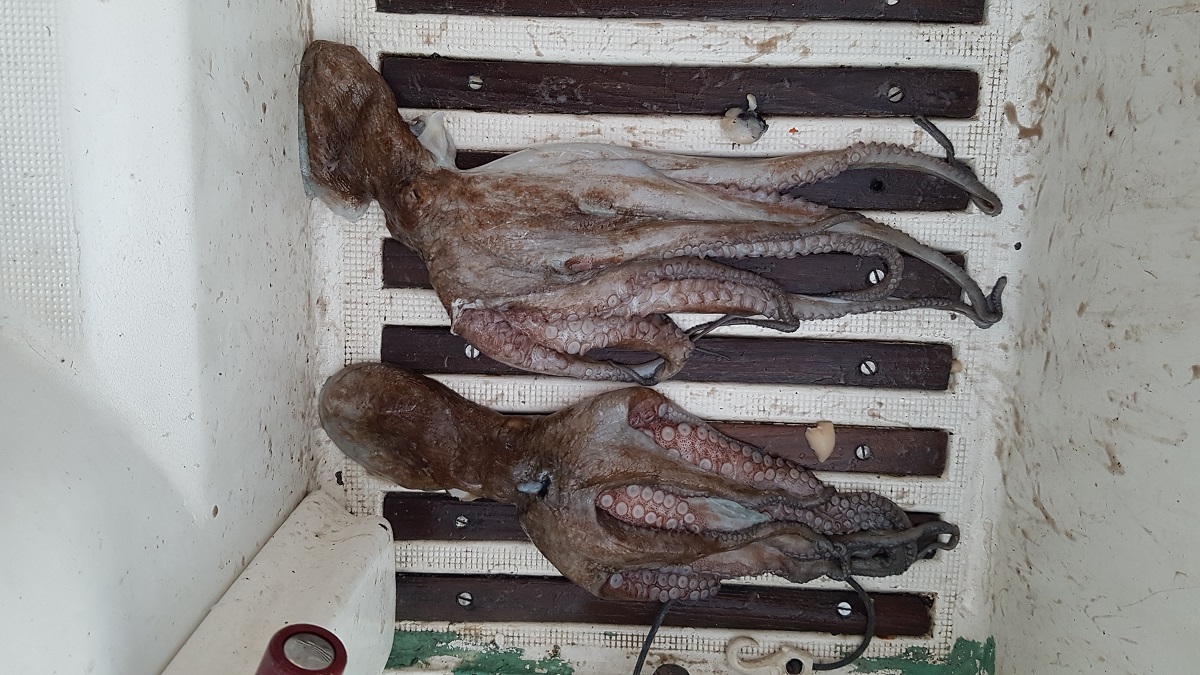 The two octopi that Michael speared for dinner, which I threw against the deck 40 times each. Thanks guys, you were delicious.