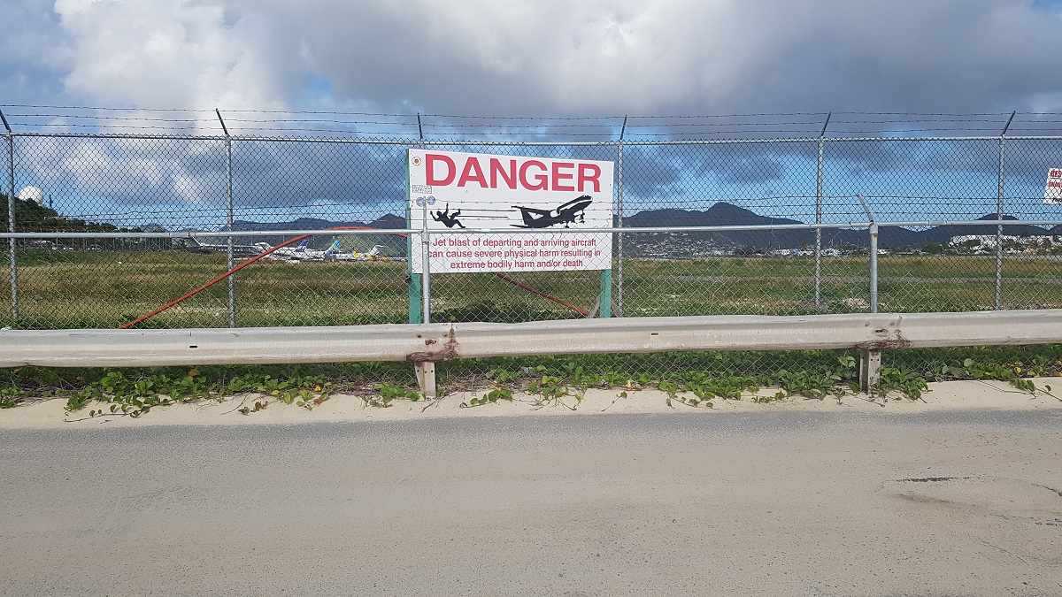 Warning sign at the famous Sint-Maarten beach, which dramatically describes why people go there in the first place. 'Cake or death?'